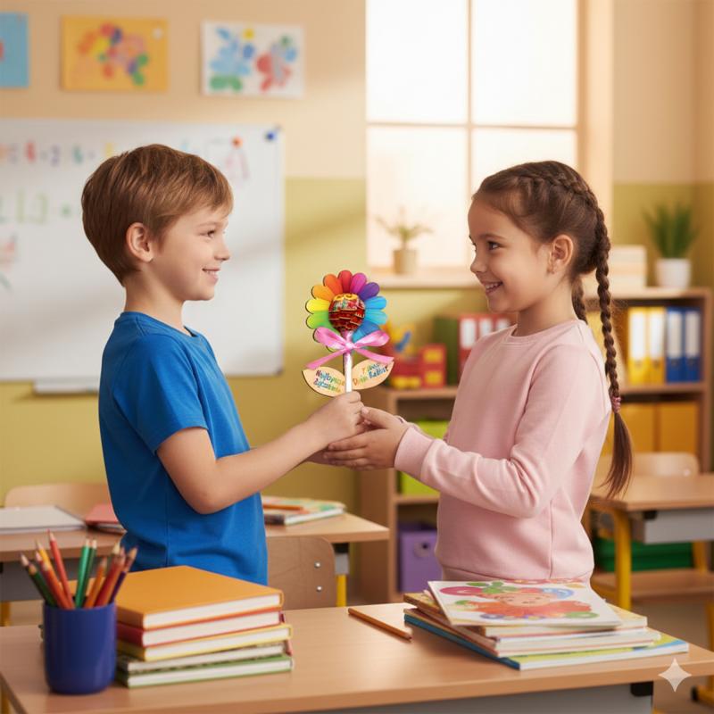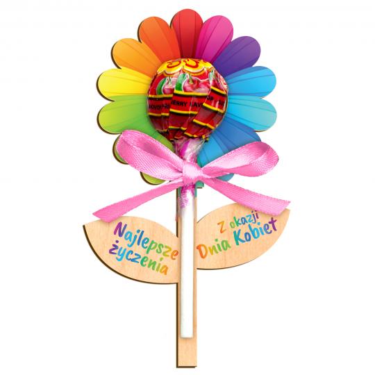 Kolorowy kwiatek na lizaka na Dzień Kobiet to radosny i efektowny upominek dla dziewczynek w szkole.