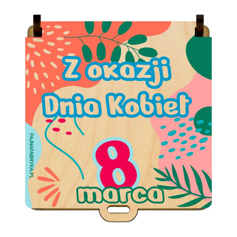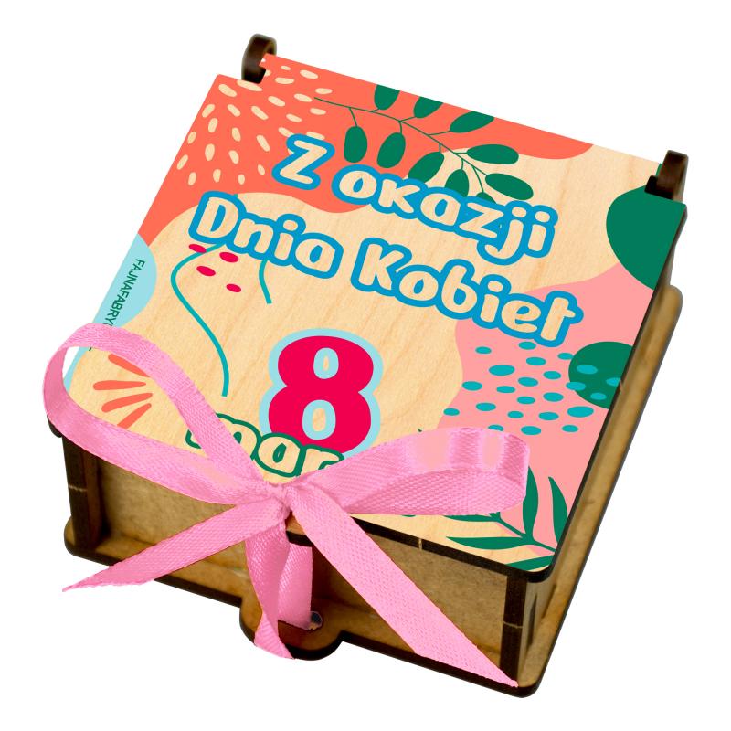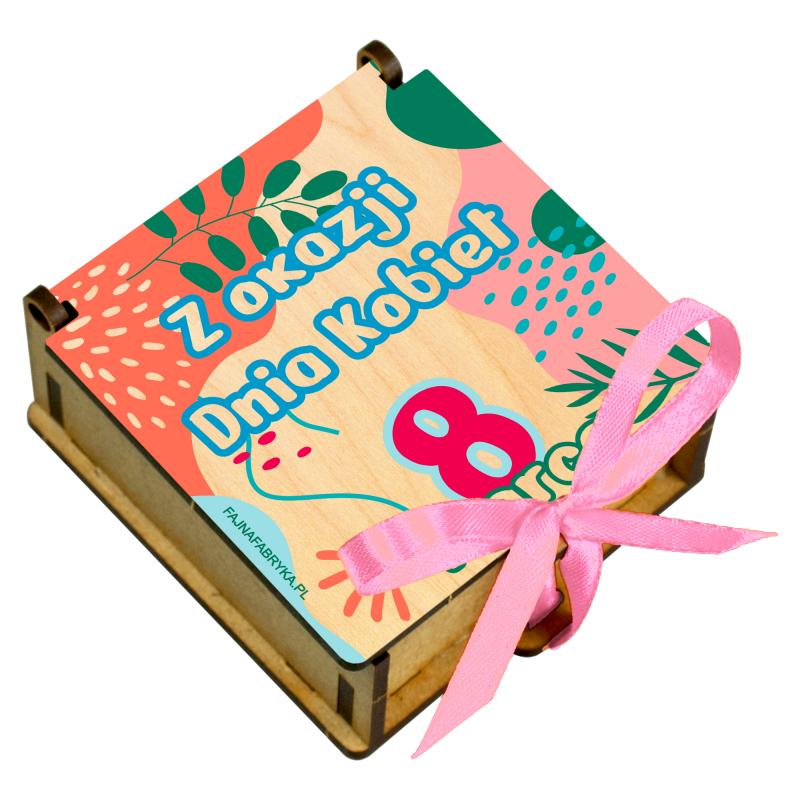 Drewniane pudełko na słodycze z kolorową grafiką Z okazji Dnia Kobiet 8 marca to gotowy upominek dla dziewczynek w przedszkolu i szkole.