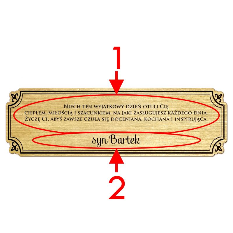 - Grawerowana złota tabliczka z dedykacją wykonana techniką laserową, przyklejona na górze skrzynki, która daje wiele lat trwałości