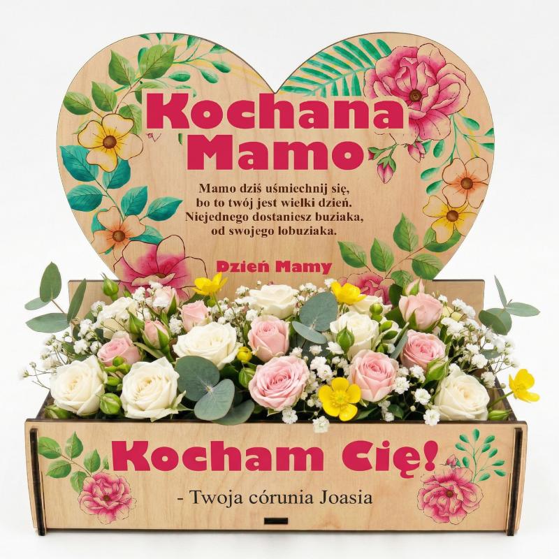 Personalizowany flowerbox na Dzień Mamy z kolorowym nadrukiem to wyjątkowy i pełen emocji prezent, który w piękny sposób wyrazi miłość oraz wdzięczność. Naturalne drewno w połączeniu z żywą, kolorową grafiką kwiatową tworzy elegancką kompozycję, idealną na tak ważną okazję.