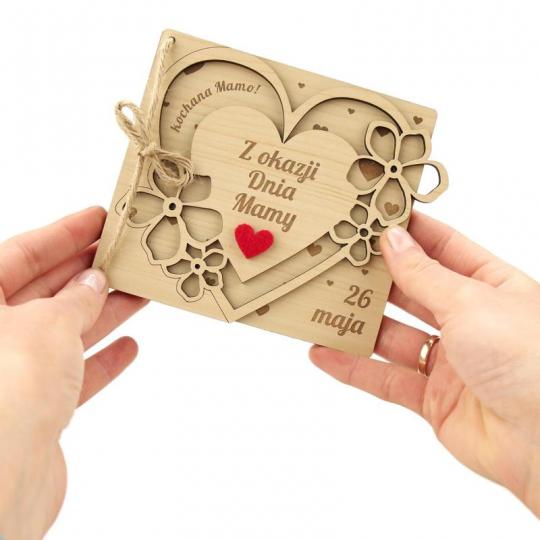 Prezent z okazji dnia mamy drewniana laurka 3D z czerwonym sercem