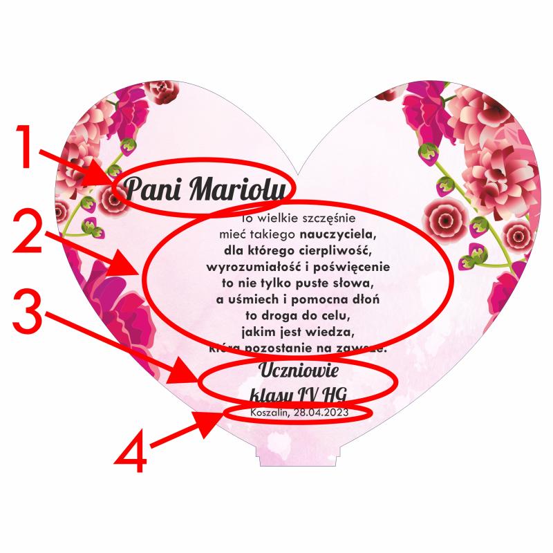 To pole jest przeznaczone na wiersz, cytat lub życzenia. Pamiętaj, aby tekst nie był za długi, ponieważ zmieni się układ tekstu, a to wpłynie na jego rozmiar. Tekst, który widzisz na zdjęciu, jest standardowy. Jeśli chcesz, aby taki pozostał oznacz w tym miejscu "Tekst bez zmian". Jeżeli chcesz inny, wpisz go w tym miejscu. Jeżeli chcesz zostawić to miejsce puste, oznacz w tym miejscu "Nie chcę personalizować tego pola (brak tekstu)".