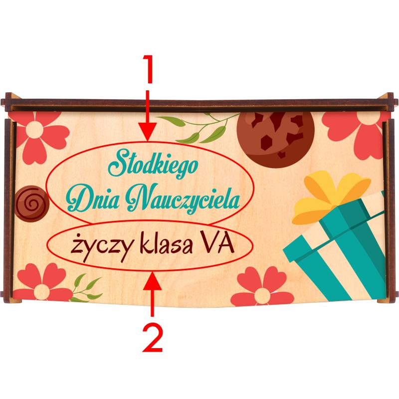 Napis „Słodkiego Dnia Nauczyciela” jest estetycznie wykonany i doskonale widoczny, co czyni pudełko nie tylko praktycznym, ale także bardzo osobistym upominkiem.