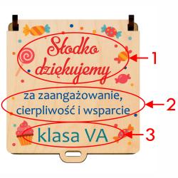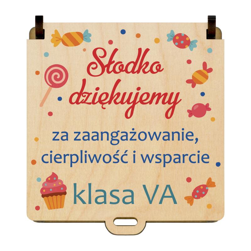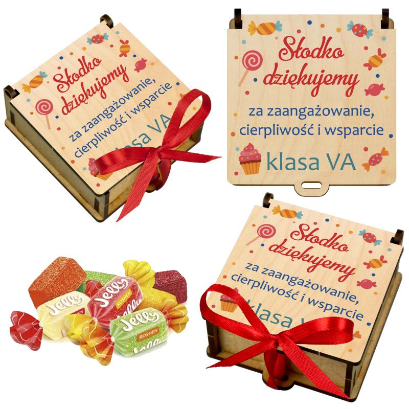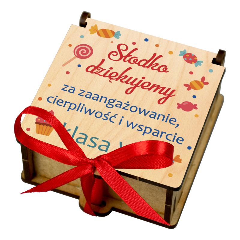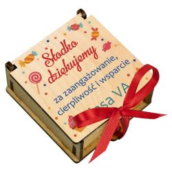Drewniane pudełko na słodycze z podpisem na Dzień Nauczyciela