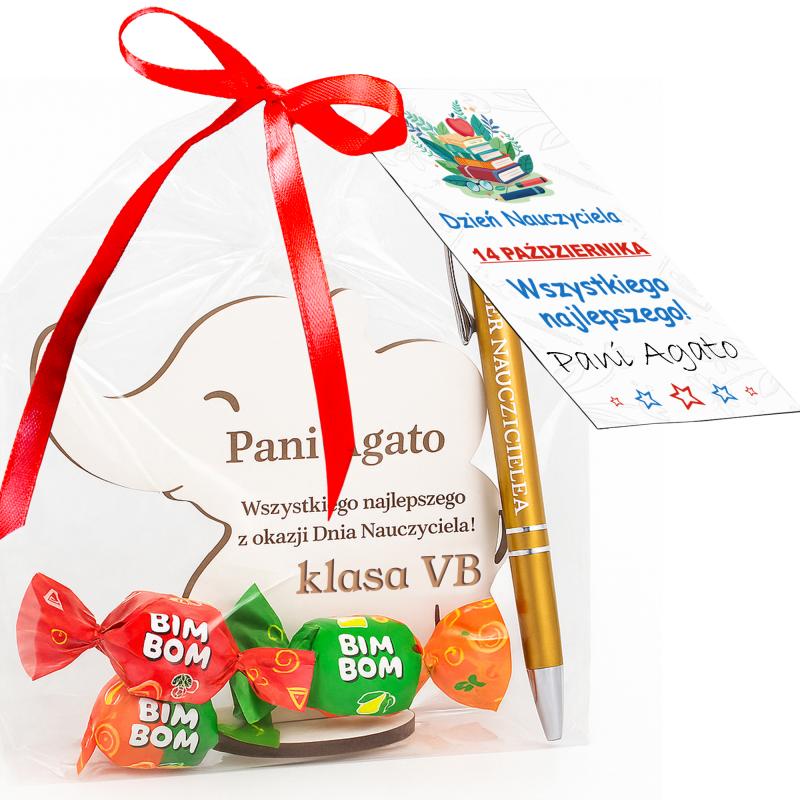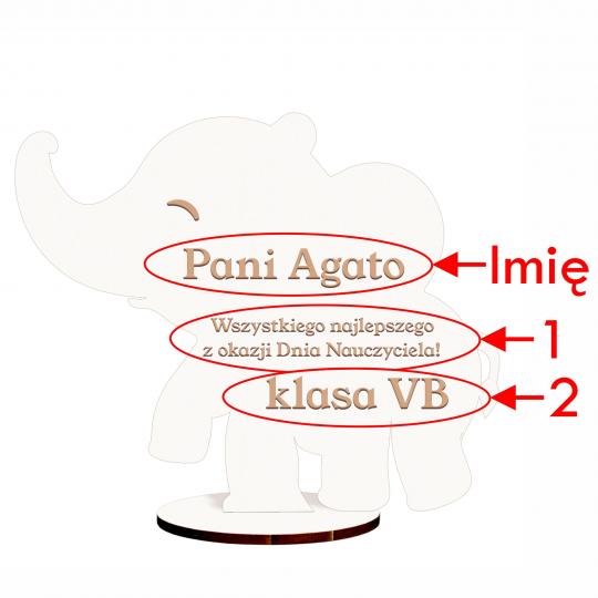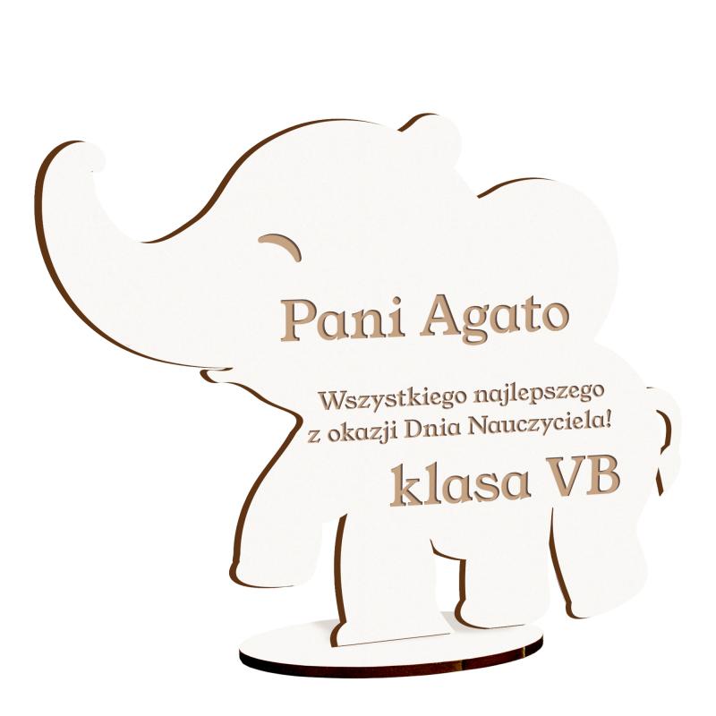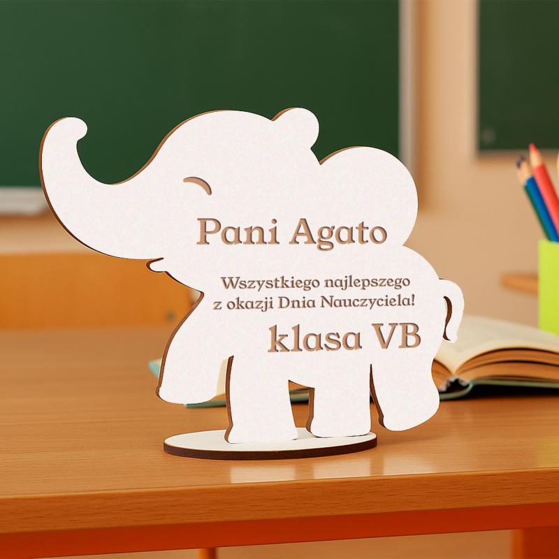 Uroczy prezent od klasy na Dzień Nauczyciela – słonik z grawerem imienia nauczyciela oraz podpisem od uczniów.