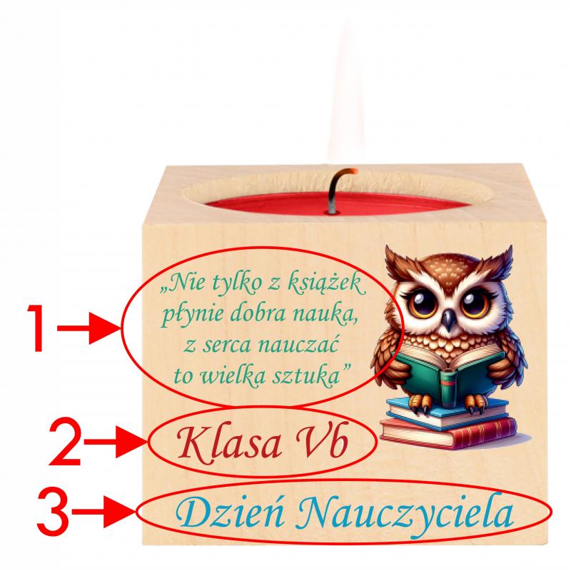 Ten drewniany świecznik to doskonały pomysł na prezent na Dzień Nauczyciela. Wykonany z naturalnego drewna, łączy w sobie estetykę i funkcjonalność. Wysokiej jakości nadruk sprawia, że prezent ten staje się unikalnym upominkiem, który wyrazi miłość i wdzięczność w wyjątkowy sposób.