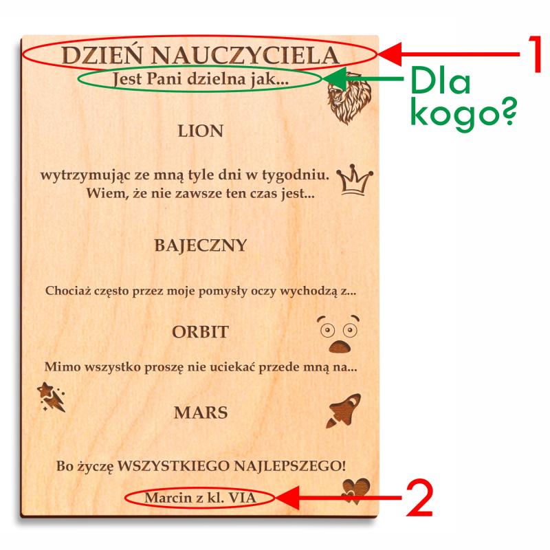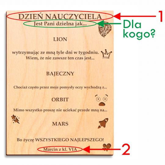 W tym miejscu wpisz, z jakiej okazji ma być tabliczka. Może to być DZIEŃ NAUCZYECIELA jak na naszym przykładzie lub ZAKOŃCZENIE ROKU SZKOLNEGO. Jeśli zaznaczysz opcję "Nie chcę personalizować tego pola (brak tekstu)", to miejsce zostanie puste.