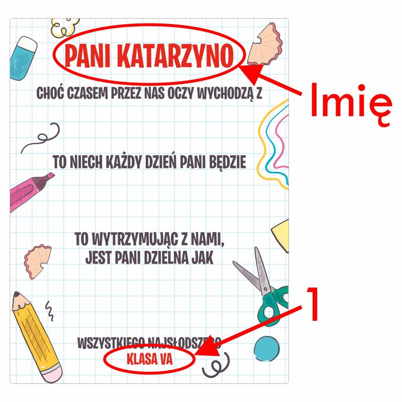 - Miejsce na personalizację – imię nauczyciela lub dedykacja