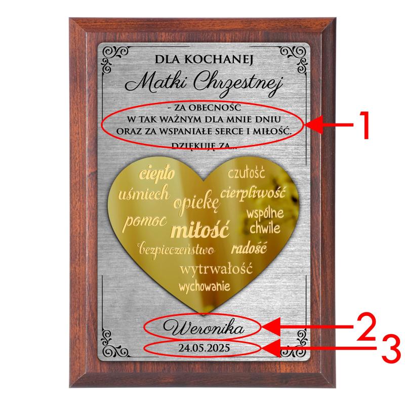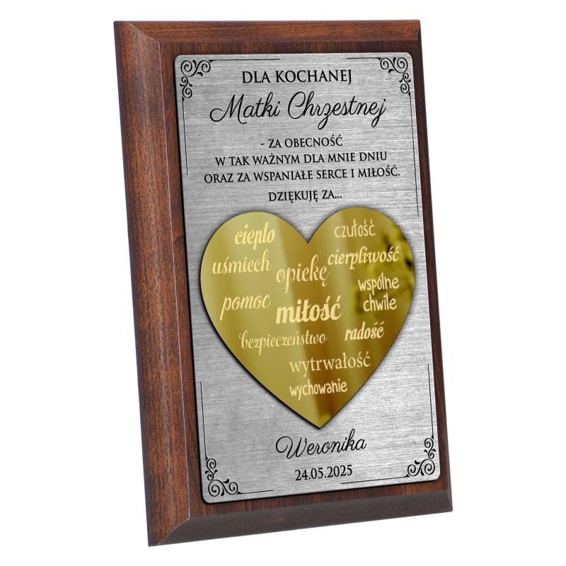 Szukasz wyjątkowego podziękowania dla Matki Chrzestnej lub Ojca Chrzestnego? Ta elegancka pamiątka to doskonały prezent z okazji Chrztu Świętego lub Pierwszej Komunii Świętej. Personalizowana tabliczka z sercem i słowami wdzięczności to wzruszający gest, który na długo pozostanie w pamięci.
