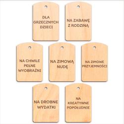 To małe tabliczki, które można wykorzystać na wiele sposobów – jako zadania, upominki lub symboliczne wiadomości. Najczęściej wybierana jest ta „NA DROBNE WYDATKI”, do której idealnie pasują pieniądze. Pozwalają dopasować zawartość szufladek kalendarza do wieku i potrzeb dziecka.