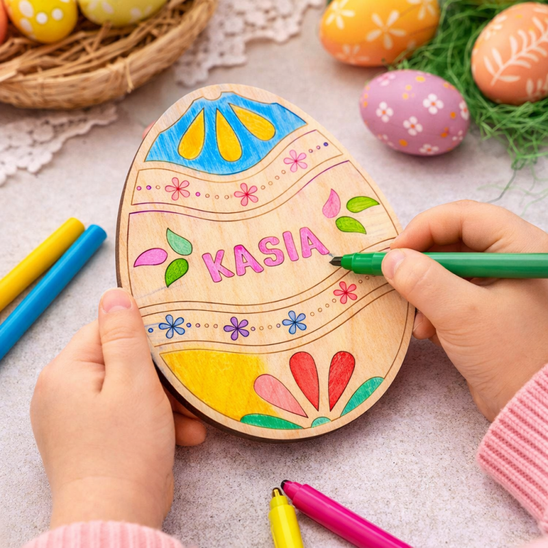 Szukasz kreatywnej dekoracji wielkanocnej, która będzie świetną zabawą dla całej rodziny? Nasza pisanka drewniana z imieniem do kolorowania to pomysł na wyjątkowe rękodzieło DIY! Możesz samodzielnie pomalować ją farbami, kredkami czy markerami, tworząc unikalną ozdobę wielkanocną.