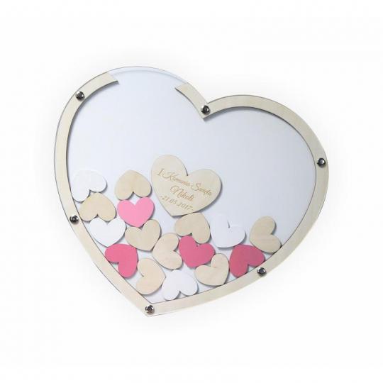 Goście wpisują życzenia na drewnianych serduszkach i wrzucają je do środka, tworząc niepowtarzalną kompozycję wspomnień z tego ważnego dnia.