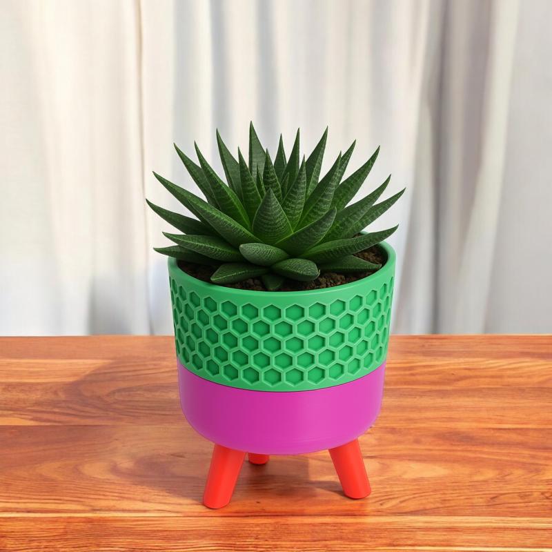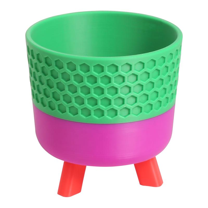 Ta kolorowa doniczka na nóżkach to doskonały wybór do każdego nowoczesnego wnętrza. Wykonana z trwałego materiału, łączy w sobie elegancję i funkcjonalność. Jej wyrazisty design z geometrycznym wzorem w postaci sześciokątów na zielonym wykończeniu, w połączeniu z różowym dołem i kolorowymi nóżkami, przyciąga wzrok i dodaje energii każdemu pomieszczeniu.