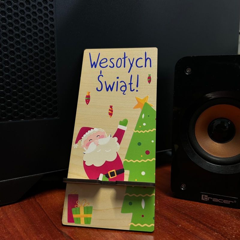 Praktyczny i dekoracyjny stojak na telefon wykonany z naturalnego drewna to doskonały dodatek do domu lub biura. Dzięki świątecznemu nadrukowi z motywem Mikołaja i choinki wprowadzi do wnętrza ciepłą, bożonarodzeniową atmosferę.