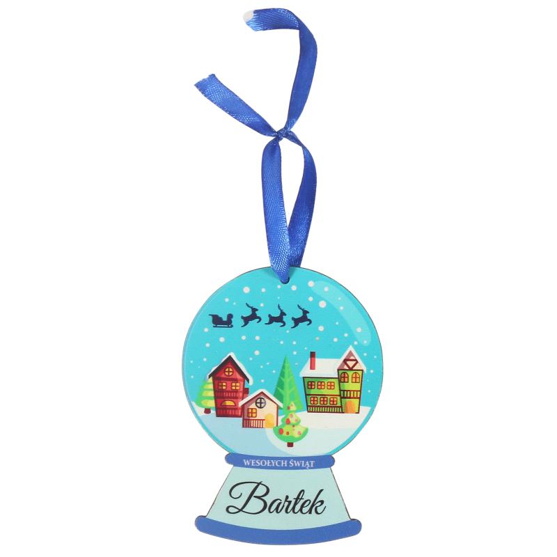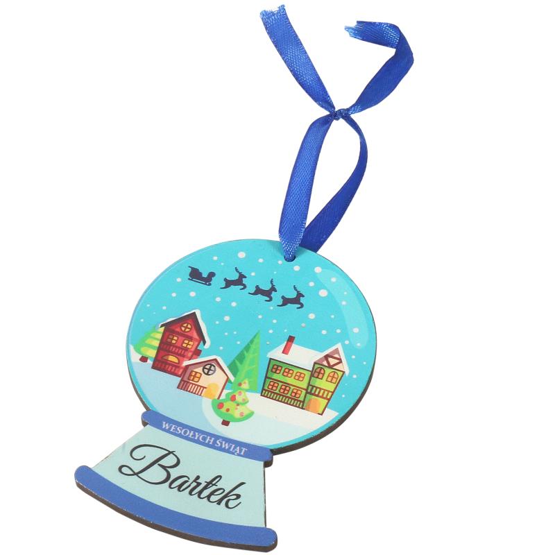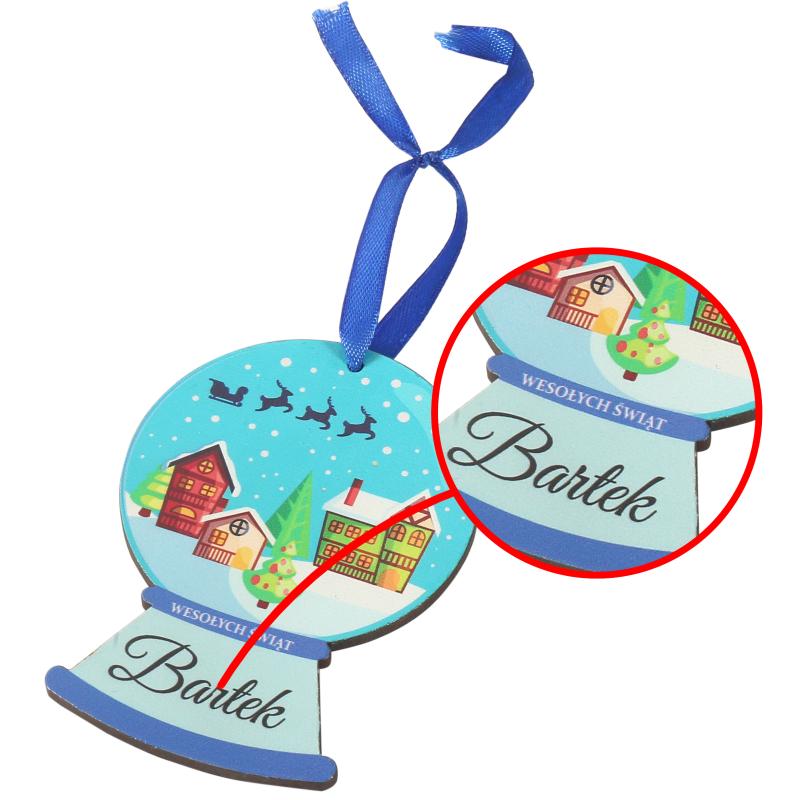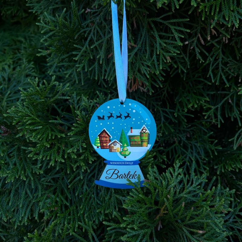 Bombka niebieska kula śnieżna z imieniem na Boże Narodzenie