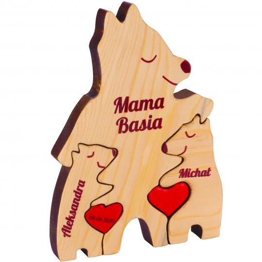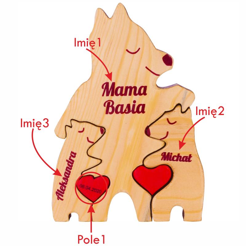 Spersonalizowane drewniane misie z rodzinna pamiątkowym prezentem. Puzzle z 3 niedzwiadkami. 1 duży 2 małe