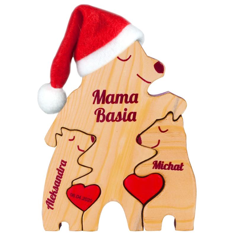 Rodzinka niedźwiadków – wersja świąteczna to wyjątkowy, personalizowany prezent, który symbolizuje miłość i bliskość między rodzicem a dzieckiem. Wykonana z naturalnego drewna układanka z grawerem imion i sercem z datą to piękna pamiątka, zachwycająca swoją prostotą i ciepłem.