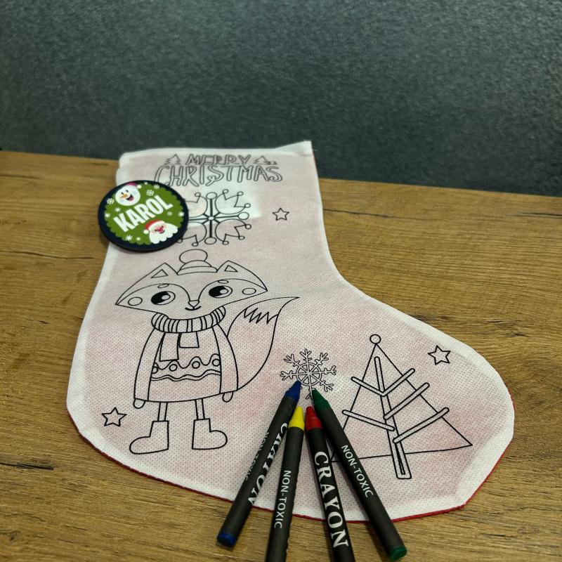 - W zestawie skarpeta, kredki (4 kolory) oraz przypinka z imieniem.