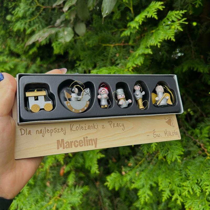 Ten elegancki komplet sześciu zawieszek świątecznych to doskonały prezent na Mikołajki, idealny do wręczenia kolegom i koleżankom z pracy, ale także bliskim i znajomym. Każda zawieszka to ręcznie wykonana ozdoba w stylu retro, przedstawiająca postacie takie jak aniołek, śnieżny ludzik, czy konik na biegunach. Ich minimalistyczny, srebrno-złoty design z subtelnymi akcentami wprowadza wyjątkowy, świąteczny klimat.
