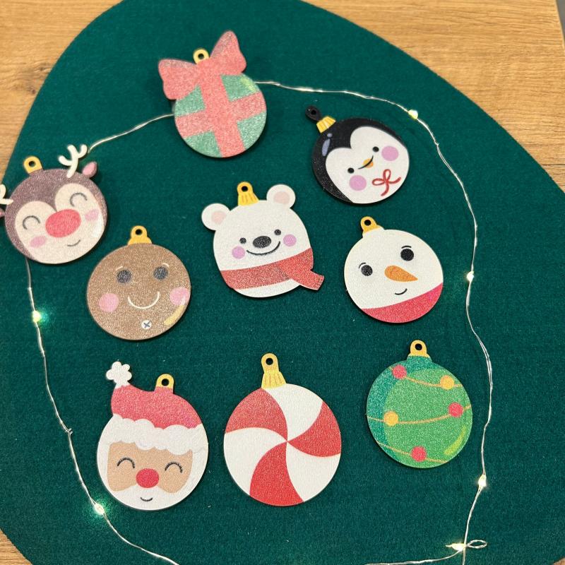 Wprowadź wyjątkowy, świąteczny klimat do swojego domu dzięki zestawowi kolorowych bombek zawieszek z drewna MDF. Każda bombka to starannie wykonana ozdoba z delikatnymi wzorami, idealna do zawieszenia na choince, oknie czy w dowolnym miejscu w domu. Zestaw zawiera 9 unikalnych bombek, które symbolizują zimowe i świąteczne motywy.