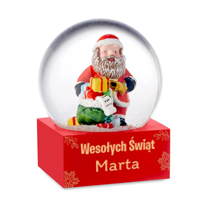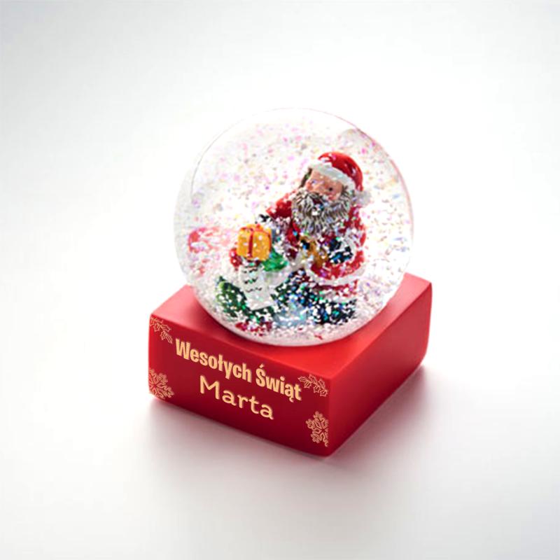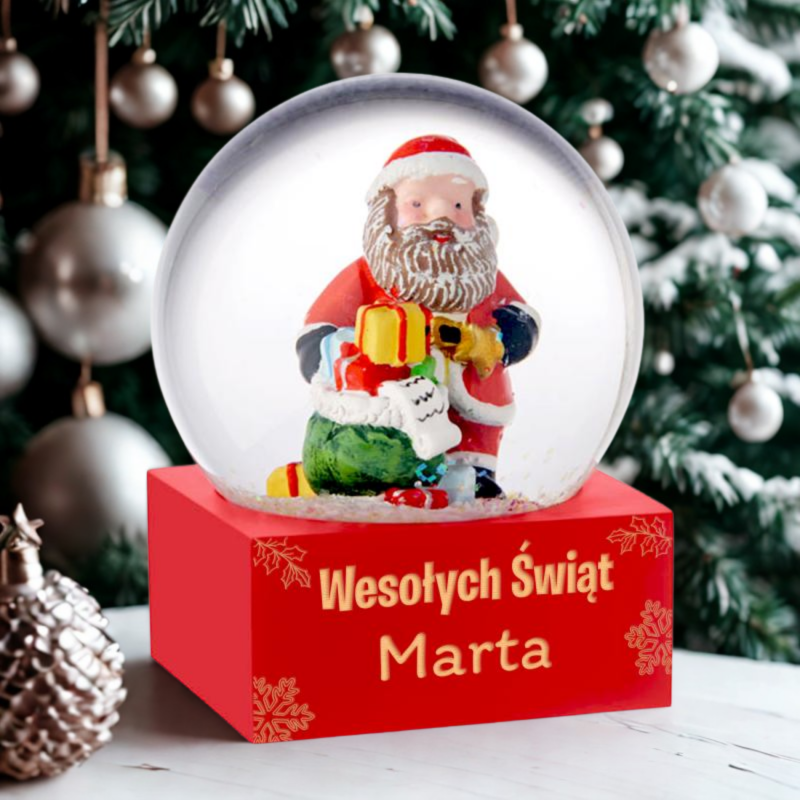 Ta personalizowana kula śnieżna to wyjątkowy prezent na Mikołajki i Boże Narodzenie, który wprowadzi magię świąt do każdego wnętrza. W środku kuli znajduje się figurka świętego Mikołaja z workiem pełnym prezentów, a po potrząśnięciu delikatne płatki „śniegu” wirują wokół postaci, tworząc przytulny, zimowy klimat. Personalizowana podstawa z imieniem oraz własnym tekstem sprawia, że upominek nabiera unikalnego charakteru i staje się piękną pamiątką świąteczną, która z pewnością zachwyci każdego obdarowanego.