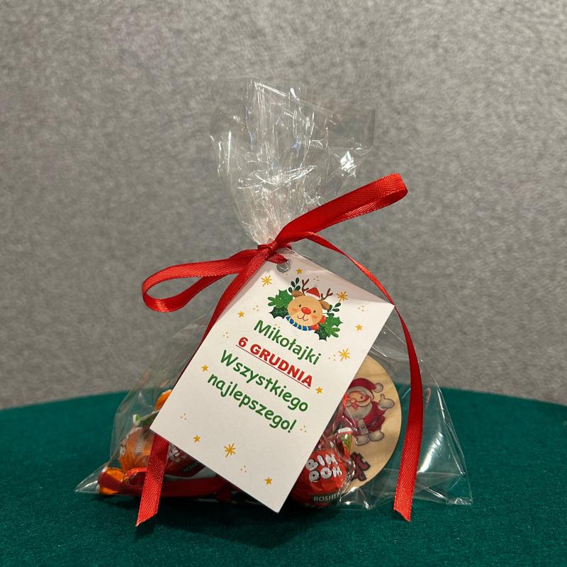 - Kartkę okolicznościową z napisem „Mikołajki, 6 grudnia, Wszystkiego najlepszego!”, z miejscem na wpisanie imienia, co dodaje prezentowi osobisty charakter.