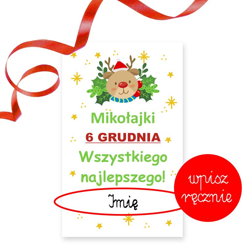 - Kartkę okolicznościową z napisem „Mikołajki, 6 grudnia, Wszystkiego najlepszego!”, z miejscem na wpisanie imienia, co dodaje prezentowi osobisty charakter.