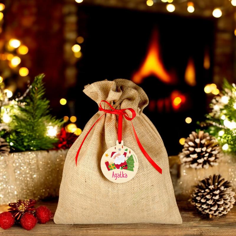 Ten elegancki worek jutowy to doskonały sposób na zapakowanie świątecznych prezentów. Wyposażony w czerwoną wstążkę do zawiązania, nadaje prezentowi estetyczny wygląd i urokliwy, rustykalny charakter. Do worka dołączona jest personalizowana zawieszka z imieniem oraz świątecznym motywem, co dodaje mu wyjątkowości i pozwala łatwo rozpoznać prezent. To idealne opakowanie na świąteczne upominki, które sprawdzi się zarówno dla dzieci, jak i dorosłych, wprowadzając radosny klimat i elegancję.