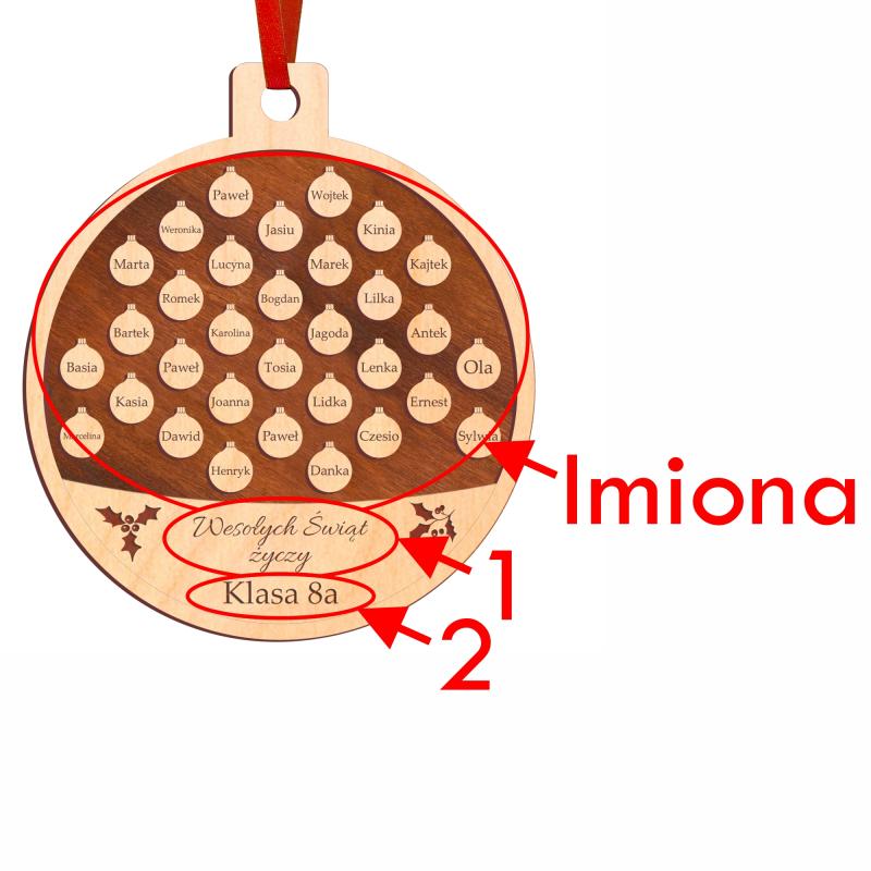 Dwuwarstwowa, personalizowana bombka z imionami to wyjątkowa pamiątka dla grupy, klasy lub zespołu. Ozdoba wykonana z wysokiej jakości drewna posiada wycięte bombki, na których znajdują się imiona uczestników, uczniów lub współpracowników. Grawerowany tekst „Wesołych Świąt” oraz nazwa grupy nadają jej indywidualny charakter. Elegancka wstążka umożliwia powieszenie na choince, wprowadzając atmosferę wspólnoty i radości. To oryginalny i piękny upominek, który zachwyci wszystkich obdarowanych i będzie miłą pamiątką na wiele lat.
