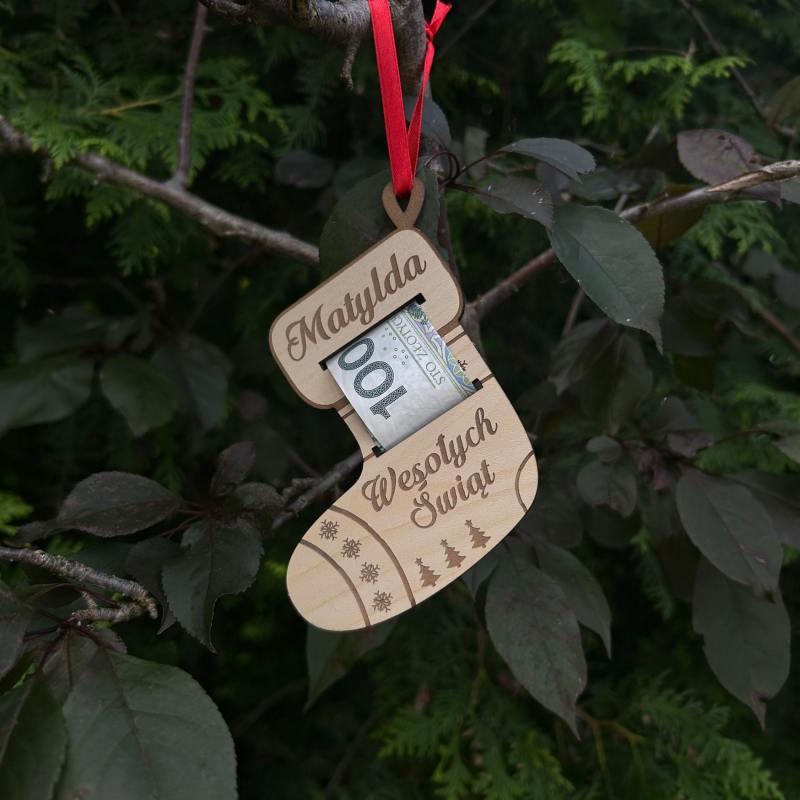 Drewniana skarpeta na pieniądze z imieniem to oryginalny sposób wręczenia świątecznego upominku. Personalizowana dekoracja posiada wycięte miejsce na banknoty, dzięki czemu staje się elegancką alternatywą dla klasycznej koperty. Grawerowane imię oraz życzenia dodają osobistego charakteru, a czerwona wstążka pozwala na powieszenie jej na choince. To praktyczny i efektowny dodatek, który sprawi radość każdemu obdarowanemu, zachowując przy tym wyjątkowy świąteczny klimat.
