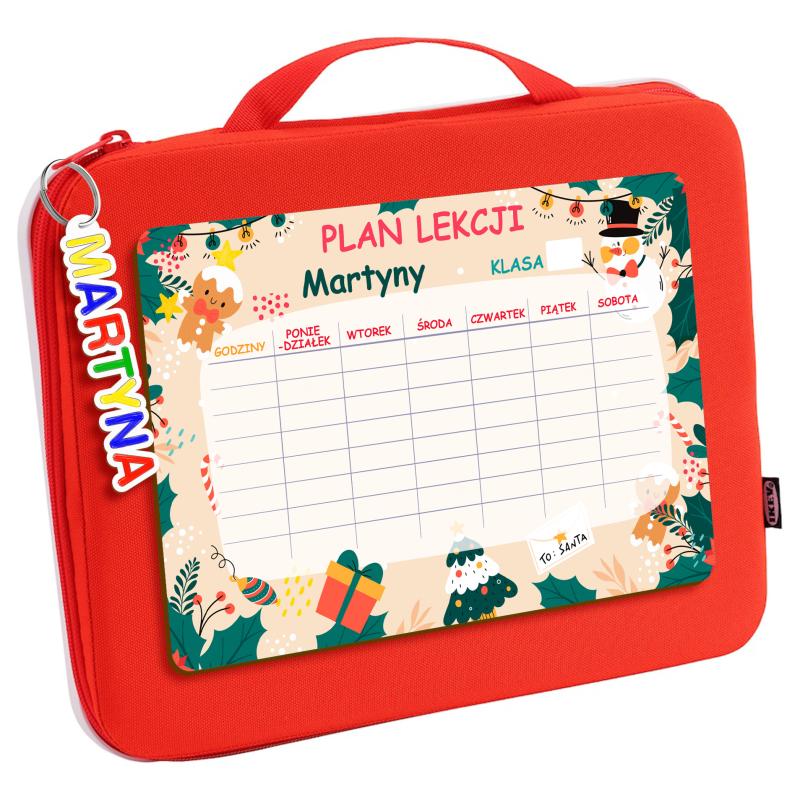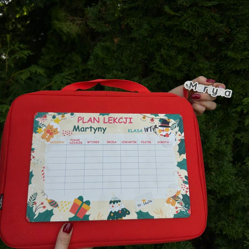 Ten uroczy zestaw prezentowy to doskonały upominek dla ucznia lub małego artysty. W skład kompletu wchodzi walizka malarska, plan lekcji z Twoim tekstem oraz personalizowany brelok z imieniem dziecka. Całość jest idealnym prezentem na Mikołajki i Święta Bożego Narodzenia.