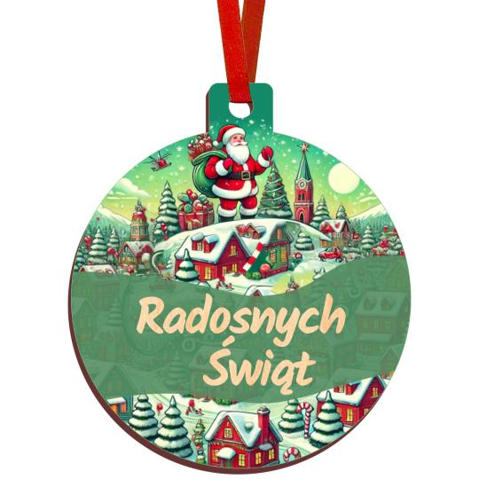 Bombka choinkowa drewniana RADOSNYCH ŚWIĄT zawieszka do prezentów