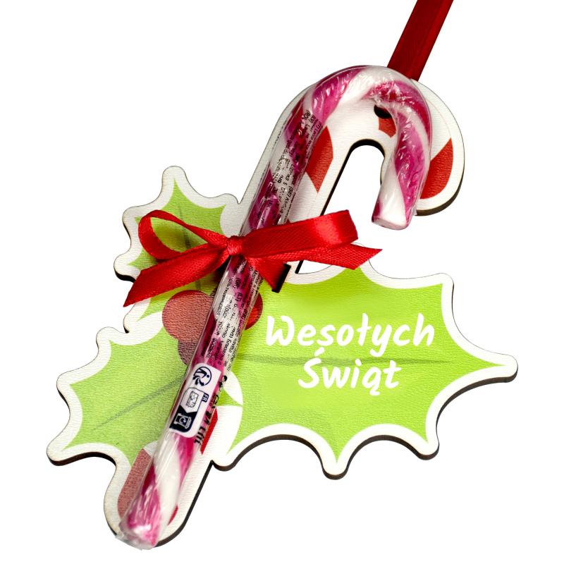 - Wesoła zawieszka na choinkę z lizakiem cukrowym, łącząca drewnianą tabliczkę z napisem „Wesołych Świąt” i słodką laskę cukrową, to idealny akcent świąteczny. Doskonała jako dekoracja, dodatek do prezentu lub drobny upominek, który wprowadzi radość i świąteczny klimat.