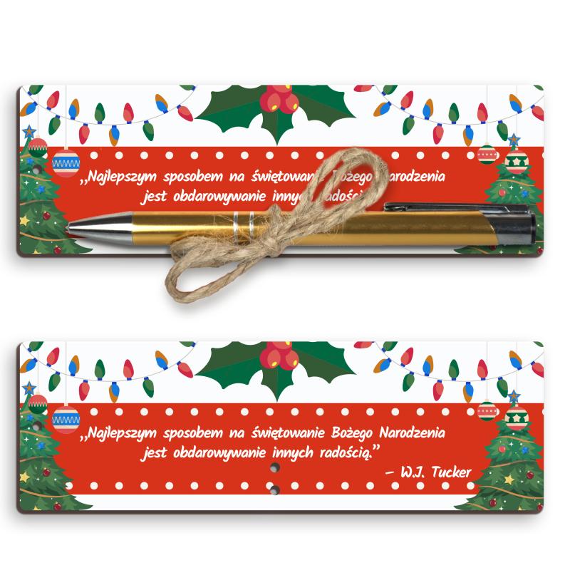- Elegancki złoty długopis na kolorowej podstawce z motywem świątecznym, która może pełnić funkcję zakładki do książki. Idealny jako praktyczny i estetyczny upominek świąteczny, który łączy funkcjonalność z wyjątkowym designem.