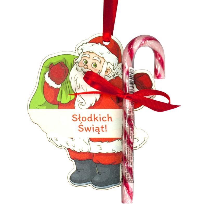 - Wesoła zawieszka na choinkę w kształcie mikołaja z lizakiem cukrowym, łącząca drewnianą tabliczkę z napisem „Słodkich Świąt” i słodką laskę cukrową, to idealny akcent świąteczny. Doskonała jako dekoracja, dodatek do prezentu lub drobny upominek, który wprowadzi radość i świąteczny klimat.