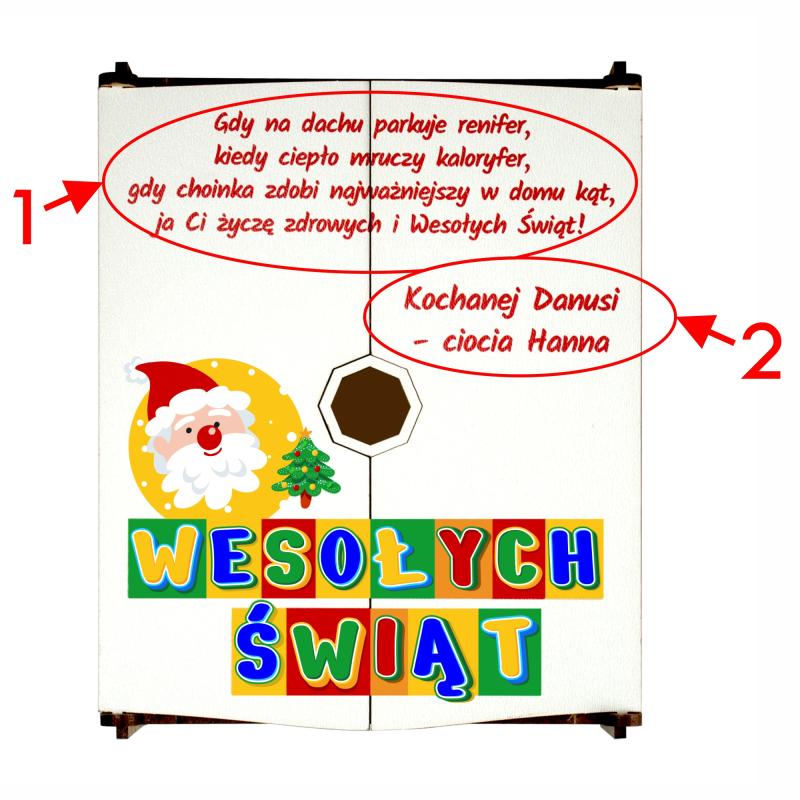 - Drewniane pudełko z personalizowanym wieczkiem to wyjątkowy sposób na przekazanie świątecznych życzeń. Dzięki możliwości umieszczenia własnego tekstu lub dedykacji, staje się niepowtarzalnym i eleganckim prezentem, idealnym zarówno dla bliskich, jak i współpracowników.