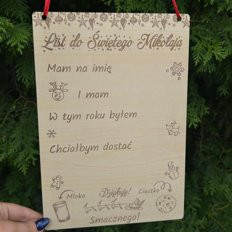 List do Świętego Mikołaja to uroczy drewniany arkusz, który pozwoli dzieciom własnoręcznie przygotować wyjątkowe życzenia. Wykonany z naturalnego drewna, ozdobiony subtelnymi świątecznymi wzorami, stanie się piękną pamiątką świąteczną.