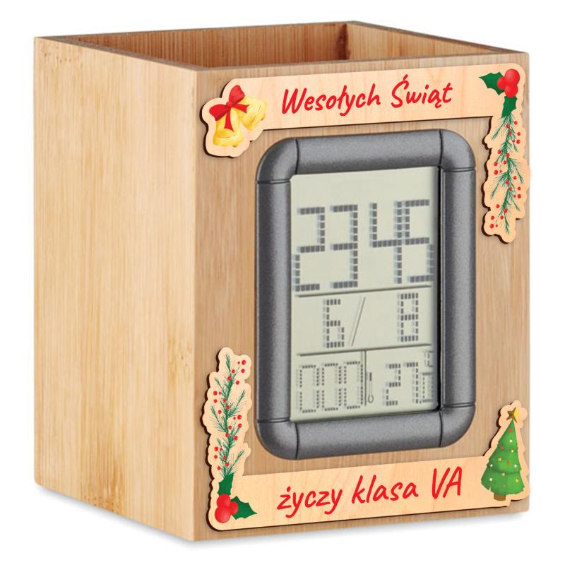 Pojemnik na długopisy z kalendarzem, budzikiem i termometrem to praktyczny i stylowy upominek, który doskonale sprawdzi się na biurku nauczyciela, współpracownika lub bliskiej osoby. Dzięki wbudowanemu wyświetlaczowi LCD możesz wygodnie sprawdzić godzinę, datę i temperaturę w pomieszczeniu.