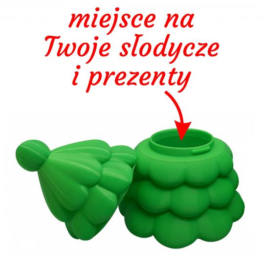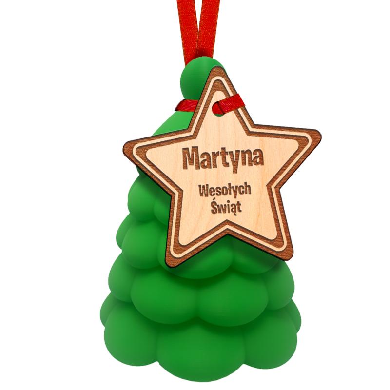 Bombka choinka z grawerowanym imieniem to urocza świąteczna ozdoba i jednocześnie pudełko na słodycze lub drobne prezenty. Wykonana z trwałego materiału, świetnie prezentuje się na choince, biurku lub jako element świątecznego upominku.
