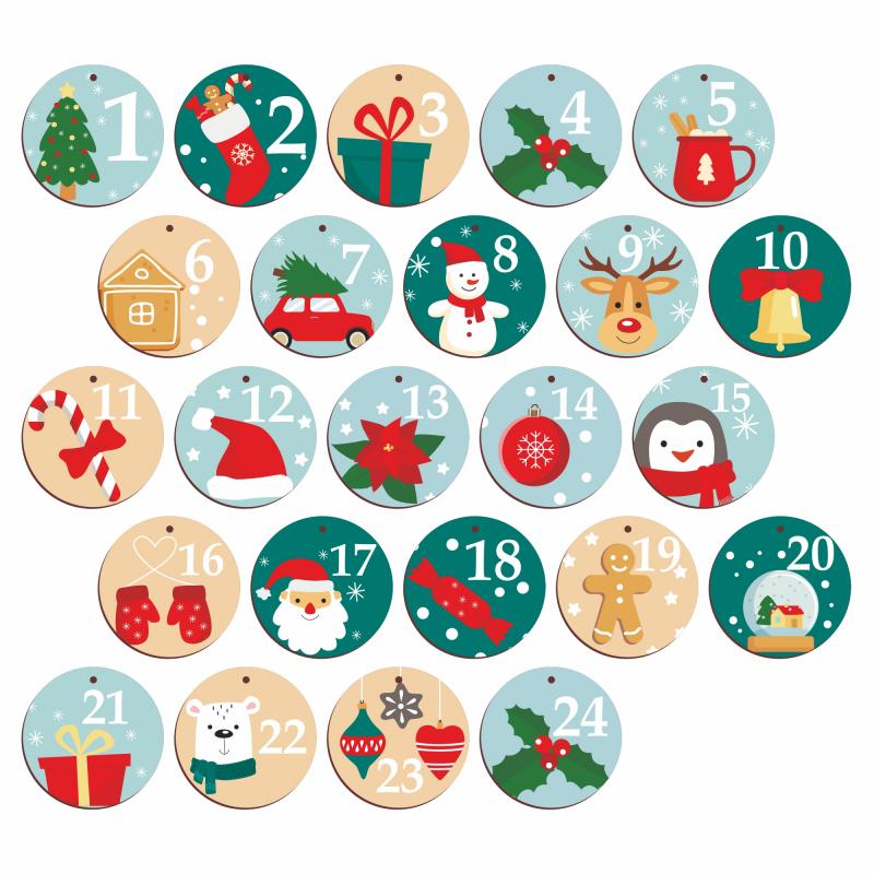 Kolorowe zawieszki z numerkami od 1 do 24 to idealny dodatek do kalendarza adwentowego lub świątecznych dekoracji. Każda zawieszka ma inny wzór inspirowany Bożym Narodzeniem – od renifera i Mikołaja po pierniczki i choinki.