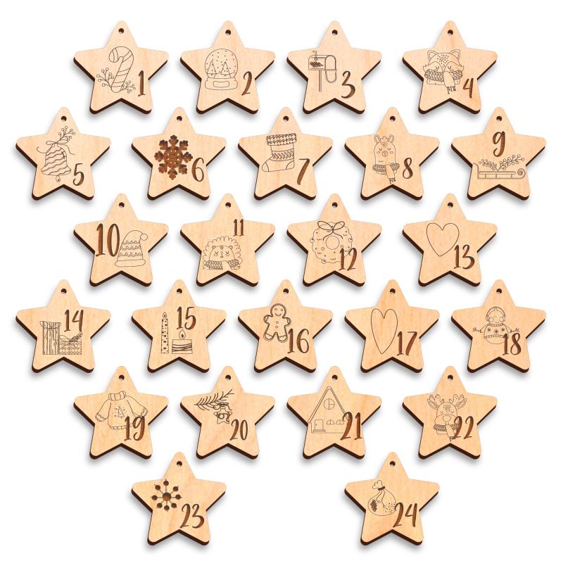 Drewniane zawieszki gwiazdki grawerowane do kalendarza 1–24