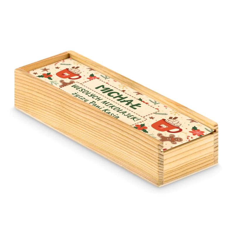 - Drewniane pudełko z personalizowaną naklejką.