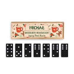 Klasyczna gra domino w świątecznym wydaniu to idealny pomysł na prezent mikołajkowy lub drobny upominek pod choinkę! Drewniane pudełko ozdobione kolorowym nadrukiem i personalizacją z imieniem sprawia, że ten zestaw nabiera wyjątkowego charakteru.