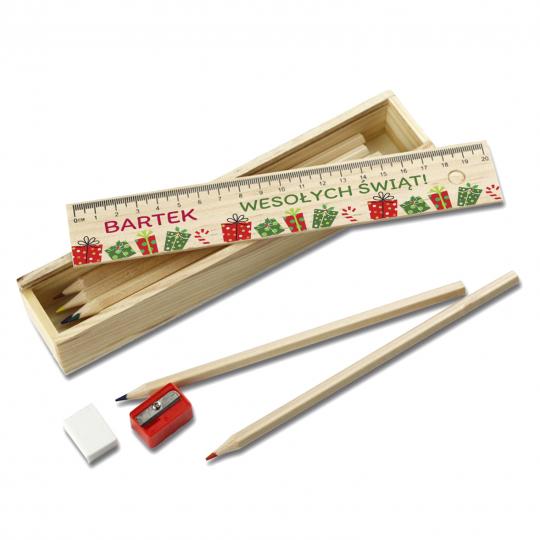 Zestaw szkolny świąteczny z imieniem w drewnianym pudełku
