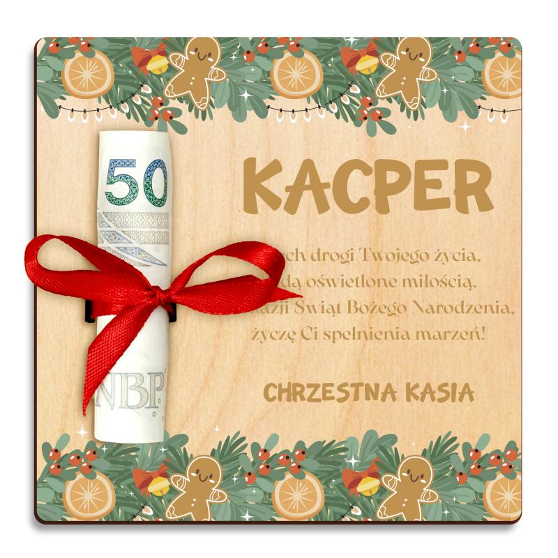 Drewniana kartka z imieniem to wyjątkowy sposób na wręczenie pieniędzy w świątecznym stylu. Ozdobiona uroczym motywem pierniczków i zielonych gałązek, stanowi nie tylko oryginalne opakowanie na prezent, ale też piękną pamiątkę na lata.