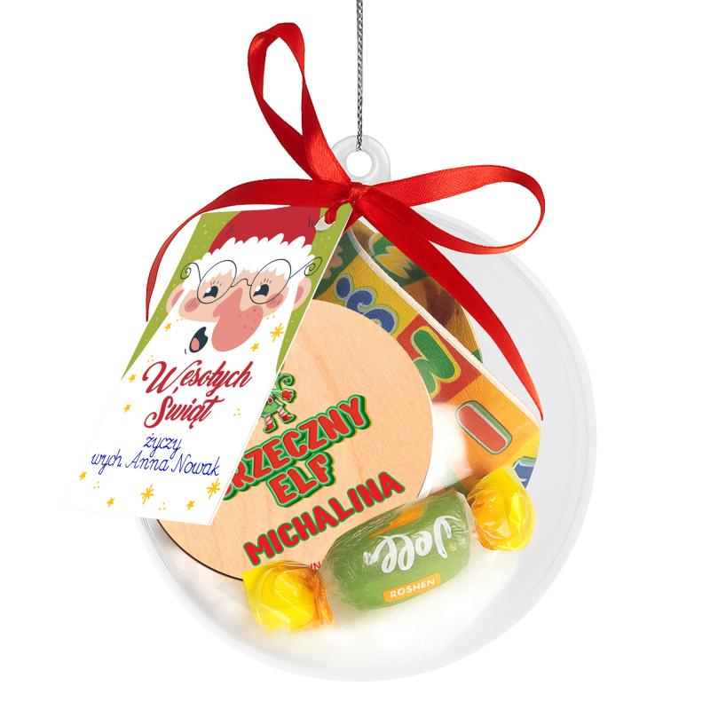 Gotowy zestaw świąteczny w przezroczystej bombce to uroczy prezent od nauczyciela lub wychowawcy dla uczniów. Każdą bombkę można powiesić na klasowej choince, tworząc wyjątkową, personalizowaną dekorację z imieniem każdego dziecka.