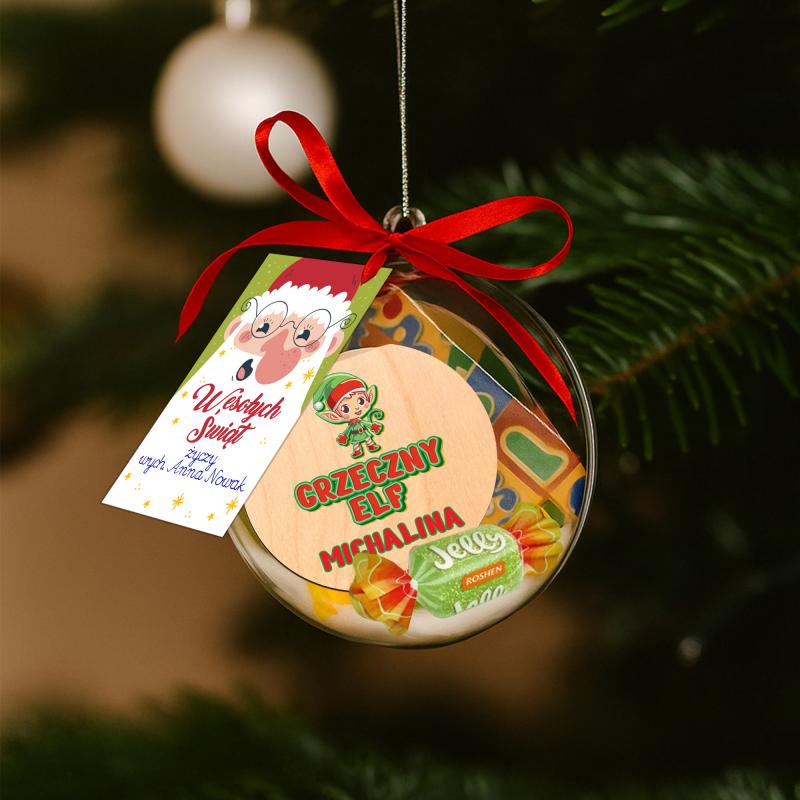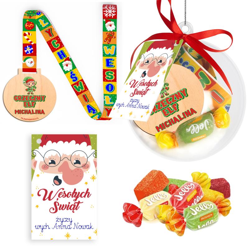 Zestaw świąteczny w bombce z imieniem ucznia smycz cukierki medal