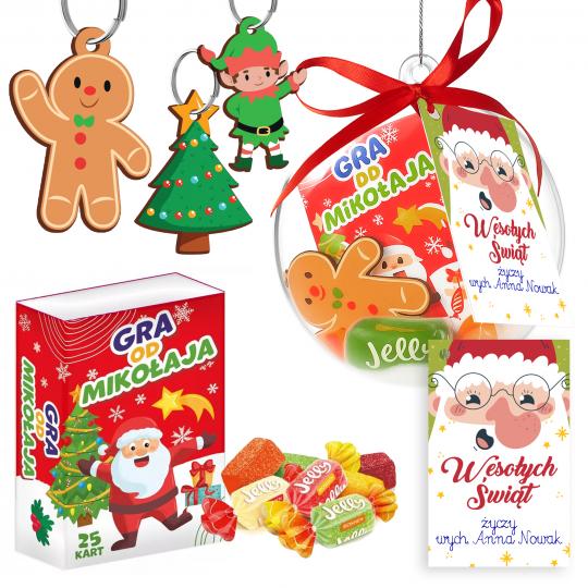 Zestaw świąteczny w bombce z podpisem brelok gra cukierki