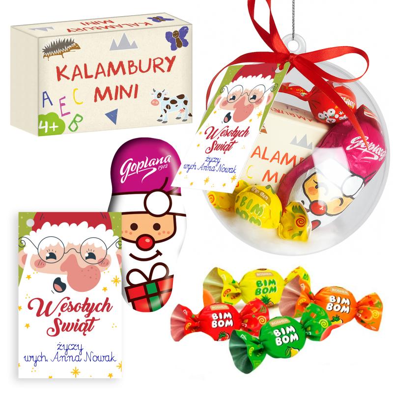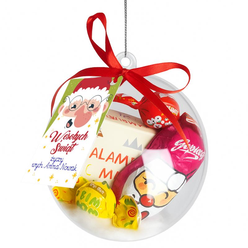 Zestaw świąteczny w bombce podpis kalambury cukierki czekoladki