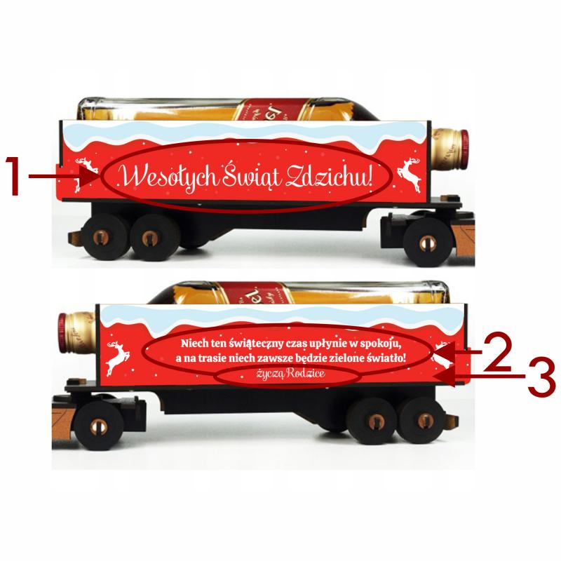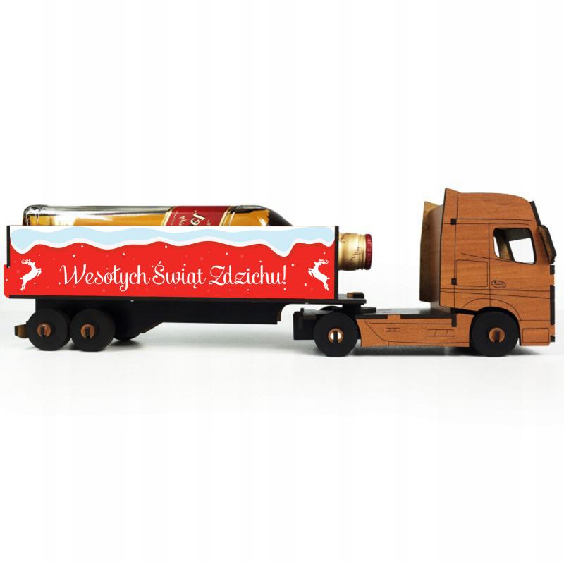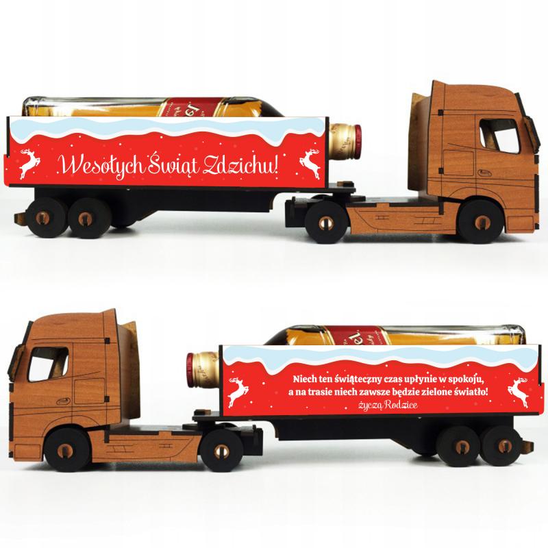 Tir Wódowóz to drewniany model ciężarówki, który pełni funkcję ozdobnego stojaka na butelkę z napojem. Jest to nie tylko efektowna dekoracja, ale również praktyczny gadżet, który pomieści butelkę o pojemności do 0,75 litra. Dzięki możliwości personalizacji możesz dodać dowolny tekst, życzenia świąteczne, imię lub nazwę firmy. To idealny sposób, aby połączyć świąteczny nastrój z oryginalnym pomysłem na prezent dla kierowcy.